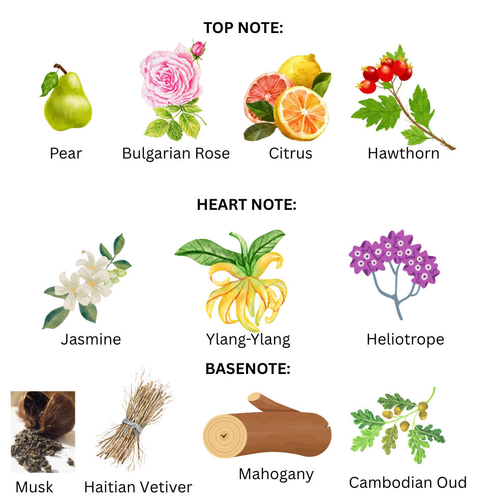 - Top Notes: Pear, Bulgarian Rose, Citruses, Hawthorn