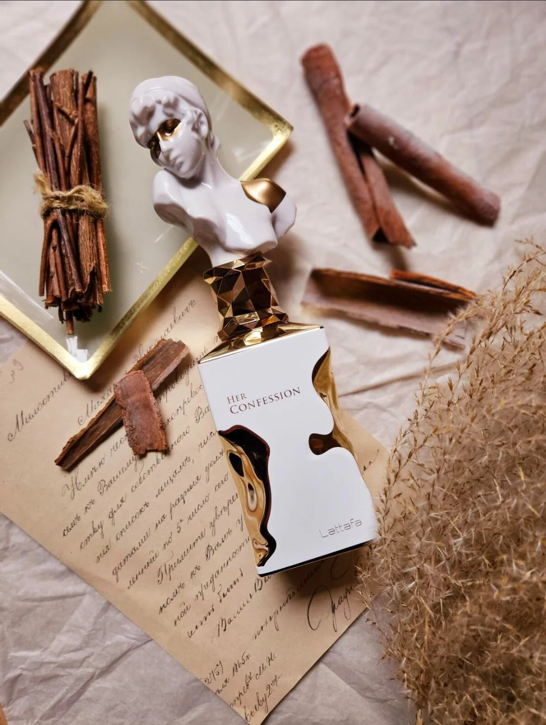 Her Confession by Lattafa Perfumes is a captivating fragrance crafted for women, unveiled in 2024. This alluring scent opens with a mysterious blend of Mystikal and warm Cinnamon, setting a seductive tone. At its heart, a rich floral fusion of Tuberose, Jasmine, Mahonial, and smoky Incense unfolds, adding depth and sensuality. The fragrance lingers with a soft, addictive base of Vanilla, Tonka Bean, and Musk, leaving behind an elegant and unforgettable trail — a true confession of femininity and allure.