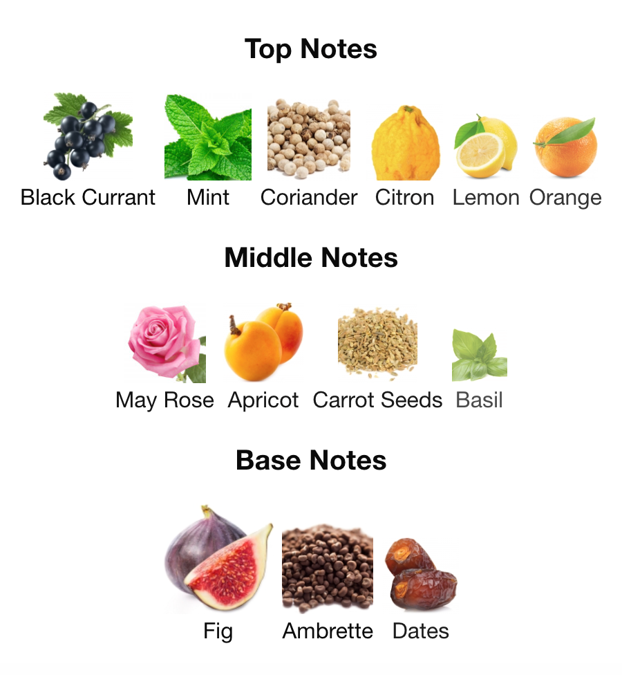 TOP NOTES: Citron, Orange, Mint, Lemon, Black Currant and Coriander;