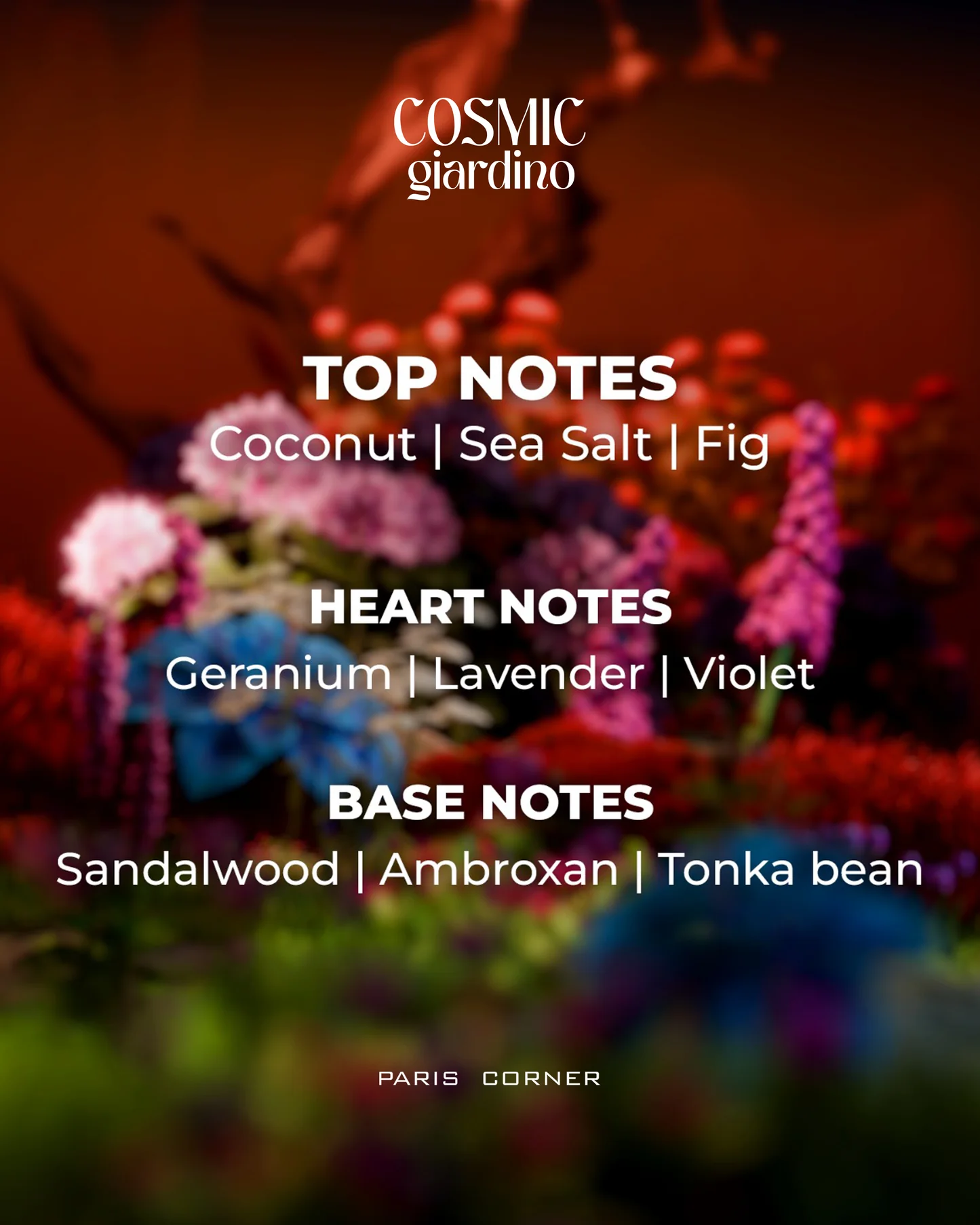 Cosmic Giardino by Corner Perfumes is a unisex fragrance that opens with notes of coconut, sea salt, and fig, creating a fresh and exotic introduction. The heart features geranium, lavender, and violet, adding a floral dimension, while the base is composed of sandalwood, ambroxan, and tonka bean, providing warmth and depth. This scent is designed to evoke a sense of balance between earthiness and ethereal qualities.